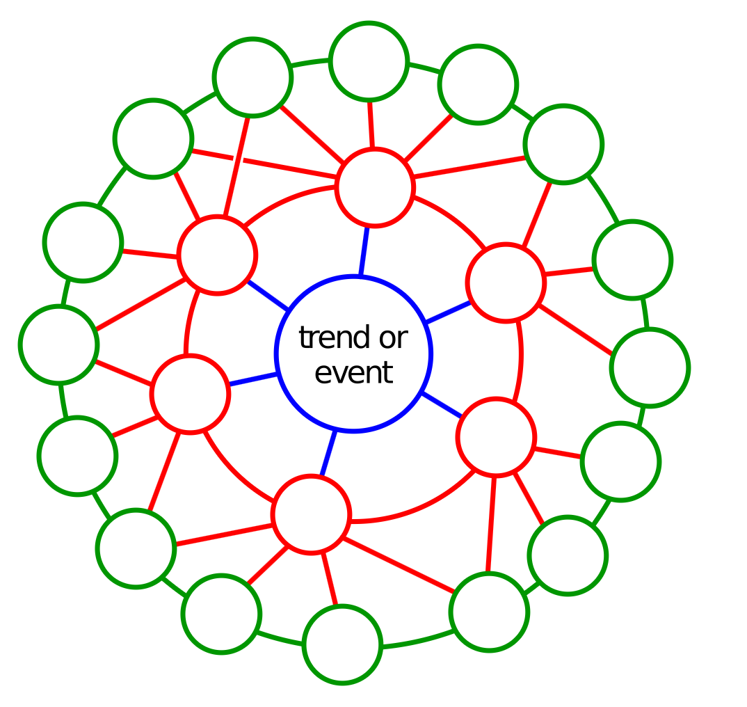 Developed by Jerome Glenn in 1971, works differently but complementarily. Starting from a specific change or trend, it maps outward through first, second, and third-order consequences — building a rich, networked picture of how a single shift might ripple through a system over time. It's a brainstorming and sense-making tool, not a prediction engine, and it's at its most powerful when used with diverse groups who bring different perspectives to the same question.